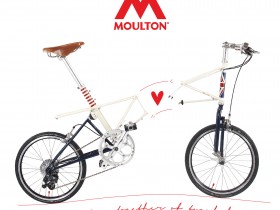 Limitiertes Moulton Grand Union, Hauptrahmen in Old English White, Gabel und Hinterbau in Windsor Blue. Das Steuerrohr wird von einem Union Jack verziert. Das Fahrrad kommt mit einem Daycarrier in Rahmenfarbe, Brooks B17 Ledersattel und Leder Lenkergriffen. Der Preis beträgt 2.750 Euro.