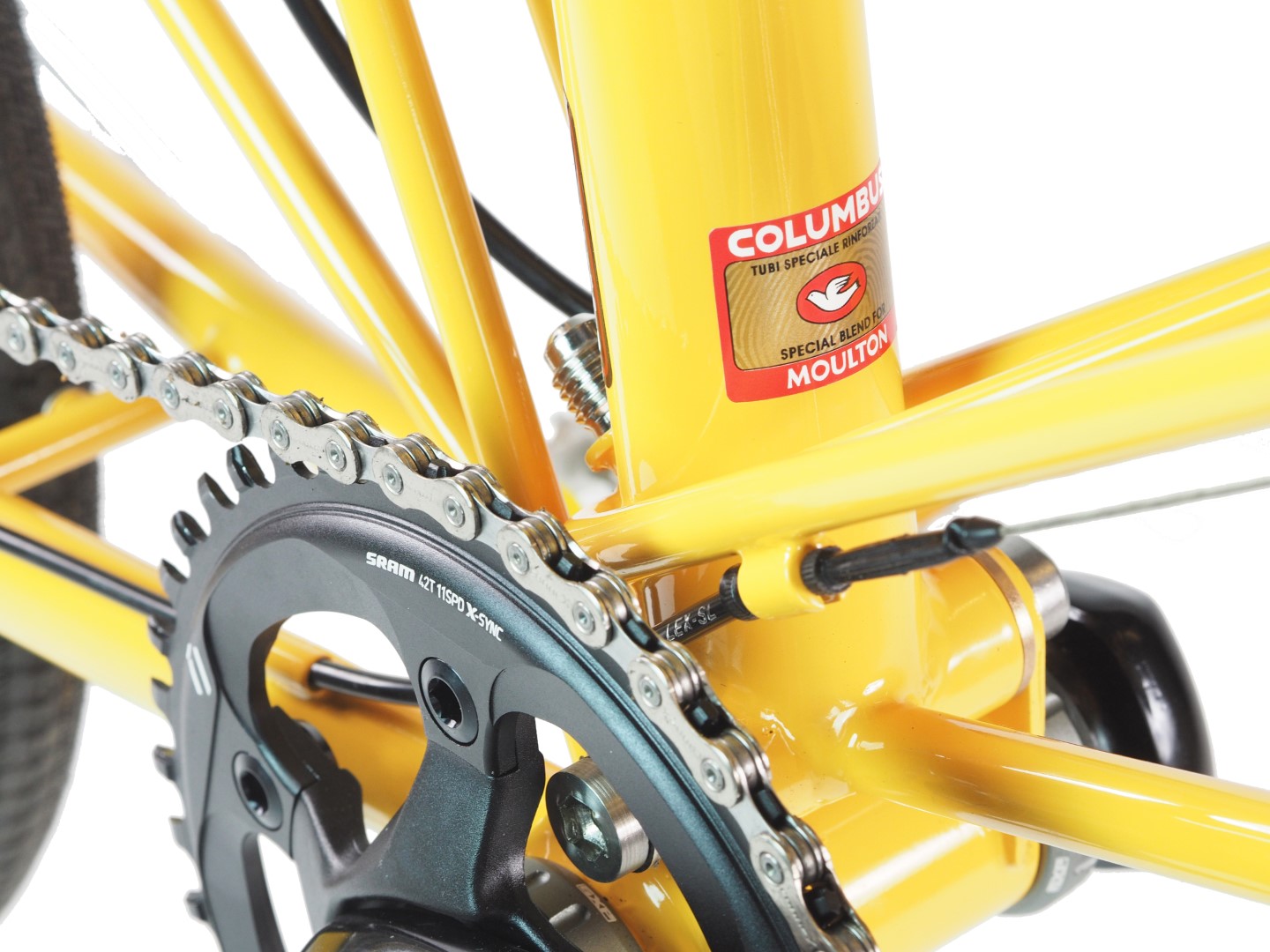 Moulton space-frame design, fillet-brazed construction inColumbus Spirit, Kaisei NiCrMo and Reynolds steels. Stainless- steel dropouts.