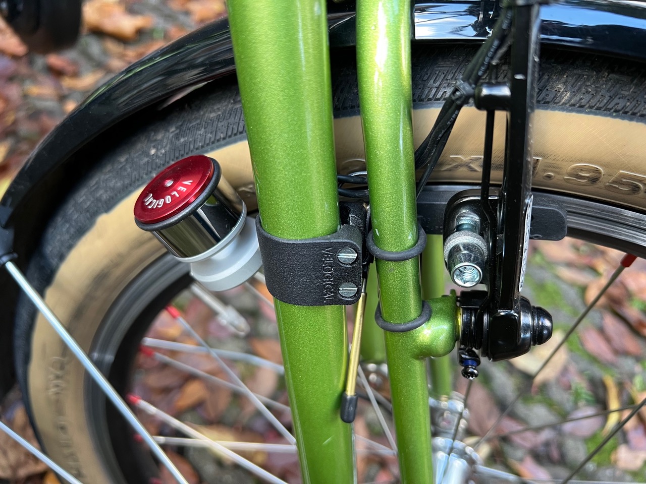 Folgende Modifikationen habe ich aber dann doch noch vorgenommen: höherer Vorbau von Ergotec – ich wollte es unbedingt höher und mehr nach vorne, natürlich komplette Lichtanlage, bisher begonnen nur, hier auf allen Fotos noch nicht final, mit Seitenläufer-Dynamo von Velological, ein Traum, das Rad dreht fast völlig frei weiter, bei angelegtem Dynamo, unglaublich widerstandsfrei, sehr smart und sieht super aus. Ich habe hier ein kleines Röhrchen angelötet, um die Bedienbarkeit zu verbessern, siehe Detailfoto. Es gibt Brompton-Dynamo-Halter von Velological, ich musste diesen Halter etwas ausschleifen, längere Schrauben hineinbringen, etwas biegen, aber dann passte er, nun ist es perfekt, nun sogar in der Art, obwohl die Gabel, an der der Dynamo hängt, ja leider mitschwingt, also der Dynamo am Reifen auf und ab läuft, aber es klappt wunderbar, unglaublich.