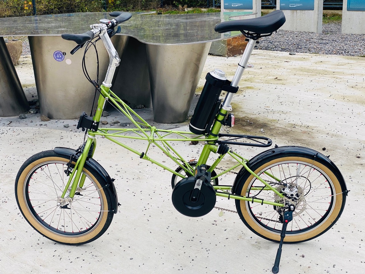 Natürlich noch meine handgelötete Bromptonträger-Schelle zur Aufnahme des Bromptonträgerblocks montiert vorne - ohne den kann ich ja gar nicht fahren - Tasche dran, perfekt. Kann man wirklich nur jedem empfehlen und dabei alles so unauffällig, so smart, man glaubt eigentlich nicht dass es ein E-Bike ist, wie immer null („0“! ) Geräusche, davon abgesehen, dass es sich auch mit ausgeschaltetem Antrieb super fahren lässt, da nur die Polfühligkeit verbleibt, aber kein Getriebe hinten in diesem Rad zusätzlich Kraft kostet.