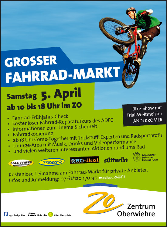 Auf dem Fahrrad-Markt im ZO wird auch in diesem Jahr wieder alles rund ums Fahrrad geboten. In Kooperation mit dem ADFC Freiburg (Allgemeiner Deutscher Fahrradclub Freiburg) findet am 05. April von 10 - 18 Uhr im ZO ein großer Fahrrad-Markt statt, mit vielen interessanten Aktionen für Radsportfans. Angeboten werden hier gebrauchte und neue Fahrräder aller Art, wie z.B. Kinderräder, Citybikes, Rennräder und Mountainbikes. Vom gebrauchten Drahtesel für die ganze Familie bis hin zu Highend-Bikes inklusive Zubehör ist alles zu haben.