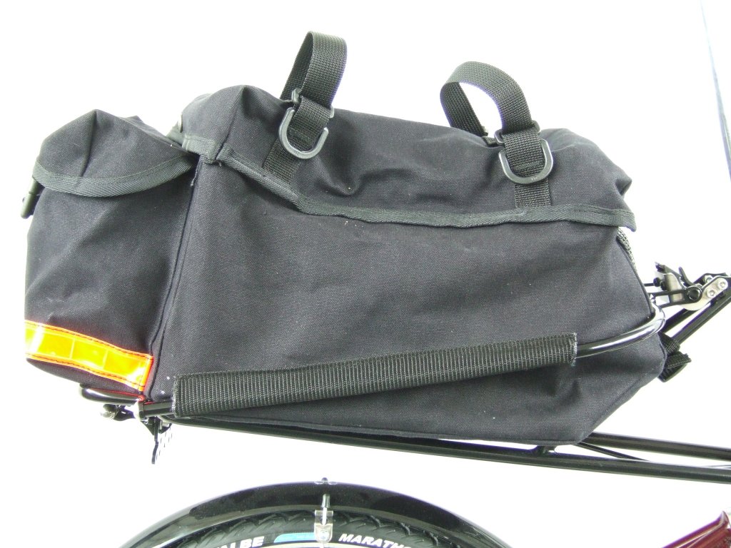 ab sofort ist eine große Gepäcktasche für sämtliche Moulton TSR Modelle lieferbar. Die Tasche wird mit einem Hilfsrahmen aus Reynolds Stahlrohr geliefert. Die Befestigung der Tasche samt Hilfsrahmen erfolgt an dem großen hinteren Gepäckträger und lässt sich dank eines ausgeklügelten Befestigungssystems schnell ab- und anbauen. Ein fester Sitz und leichte Bedienbarkeit wird dadurch garantiert.