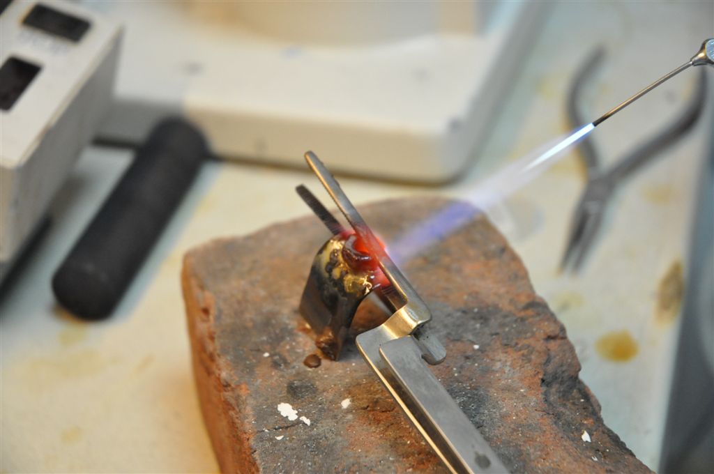 Man sieht einen Blechstreifen, an den eine Mutter per Hartlötung angebracht wird.